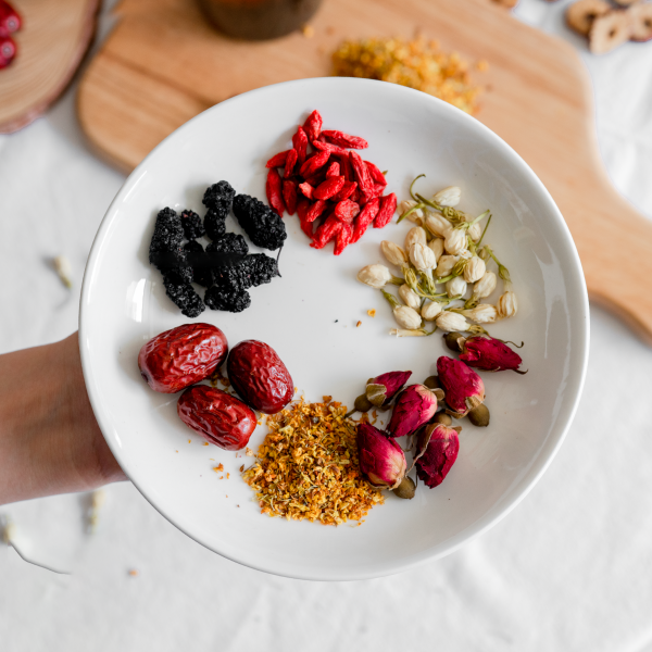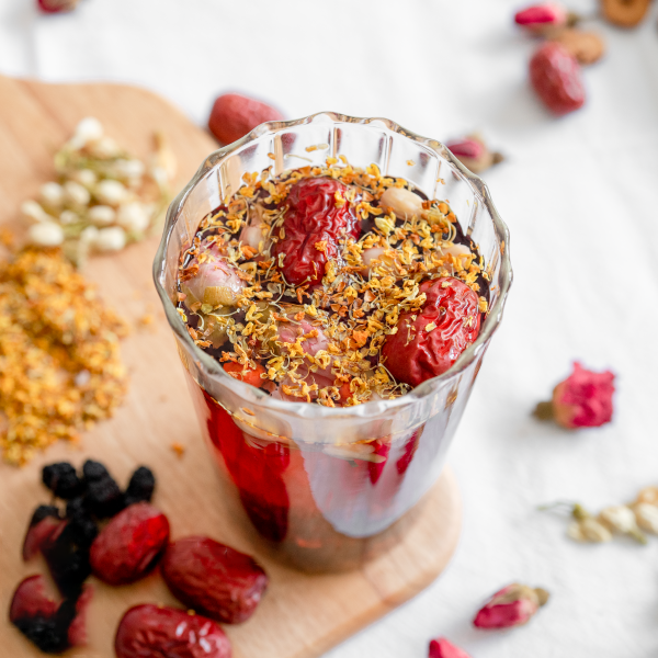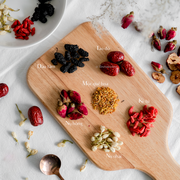 Trà dâu tằm, táo đỏ, nụ hồng, mộc quế hoa, kỷ tử, nụ nhài