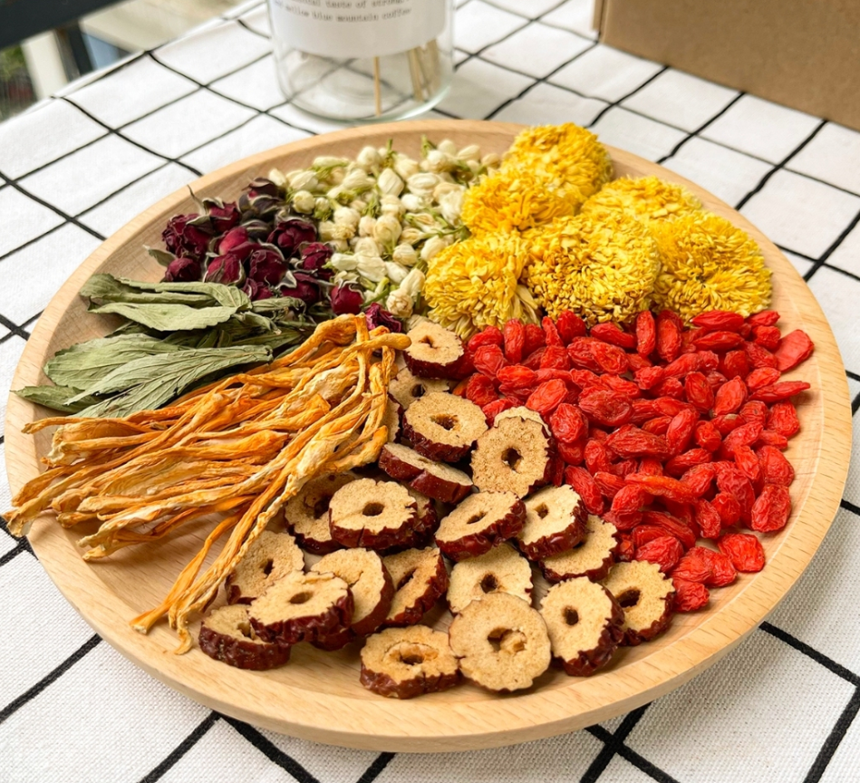 ❖ Thành phần: Nấm Đông Trùng, Táo đỏ lát, Kỷ tử, Hoa cúc vàng, Nụ nhài, Nụ hồng, Cỏ ngọt